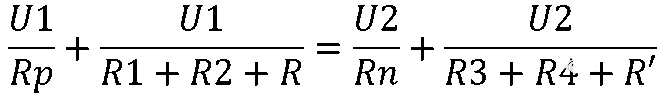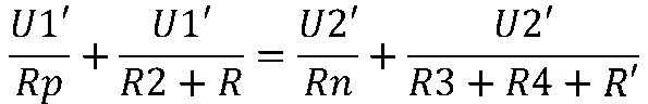 通過電子開關改變電路通斷,從而改變電池正負極對地絕緣電阻Rp、Rn上的電壓U1、U2(閉合K得到的電壓用U1’、U2’表示),聯(lián)立兩次不同開關狀態(tài)下的電路方程可以求解正負極的對地GND絕緣電阻。其中R1~R4為已知大電阻,R、R’為已知的分壓電阻,其阻值遠小于R1~R4。開關K斷開時,通過AD轉換得到Rp、Rn兩端電壓,得到下列方程: